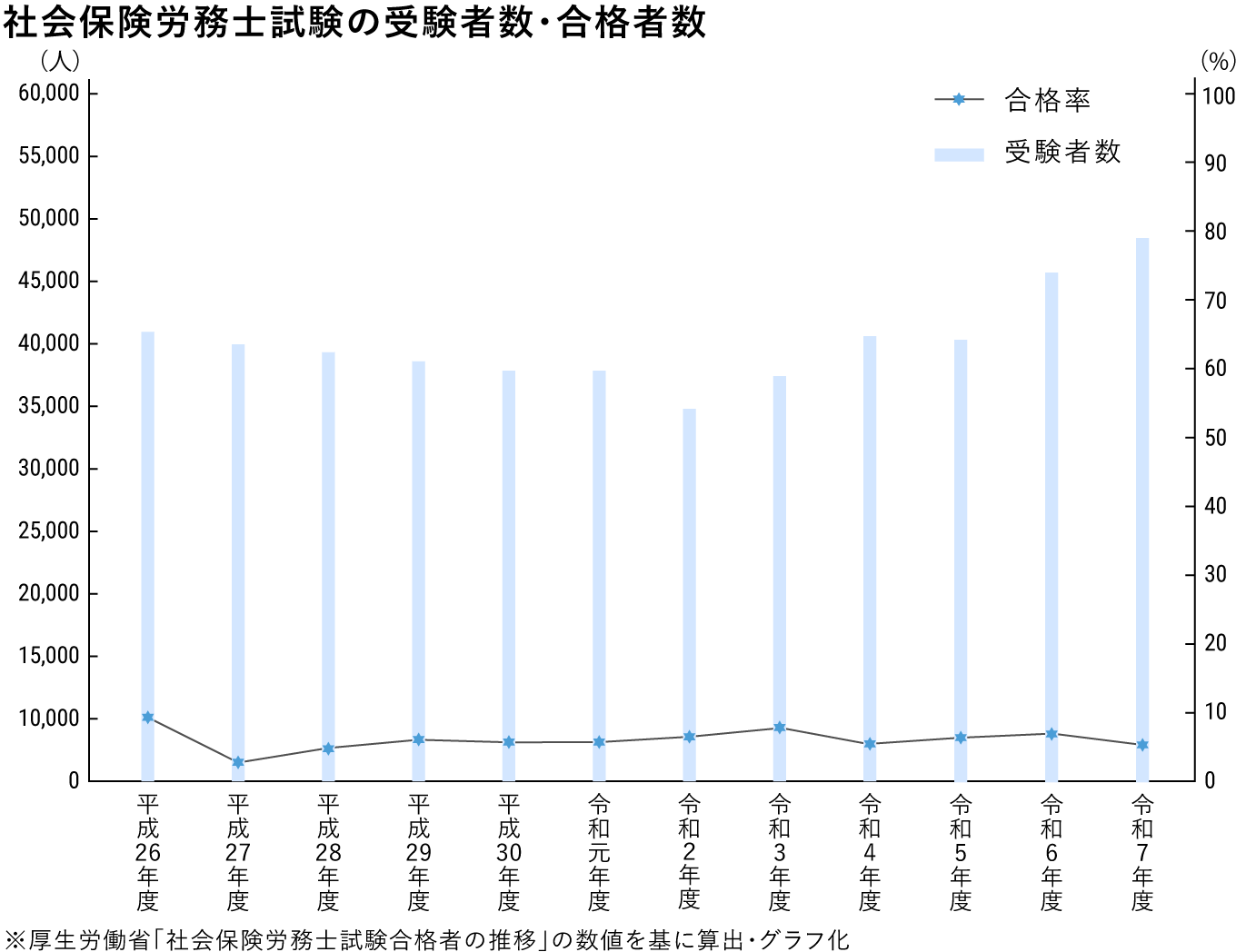 社労士試験の合格率は毎年数%で推移しており、難易度は高いといえます。下のグラフを見れば、その合格率の低さは一目瞭然でしょう。