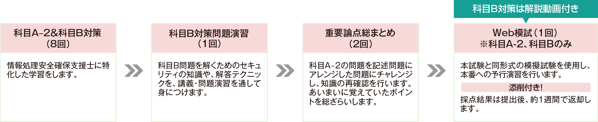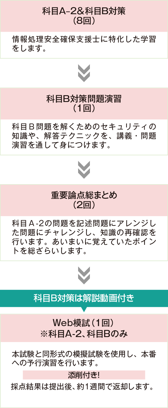 科目A-2試験から科目B試験に必要なスキルを「説明→科目A-2問題演習→科目B問題演習」のステップで効率よく知識を養います。