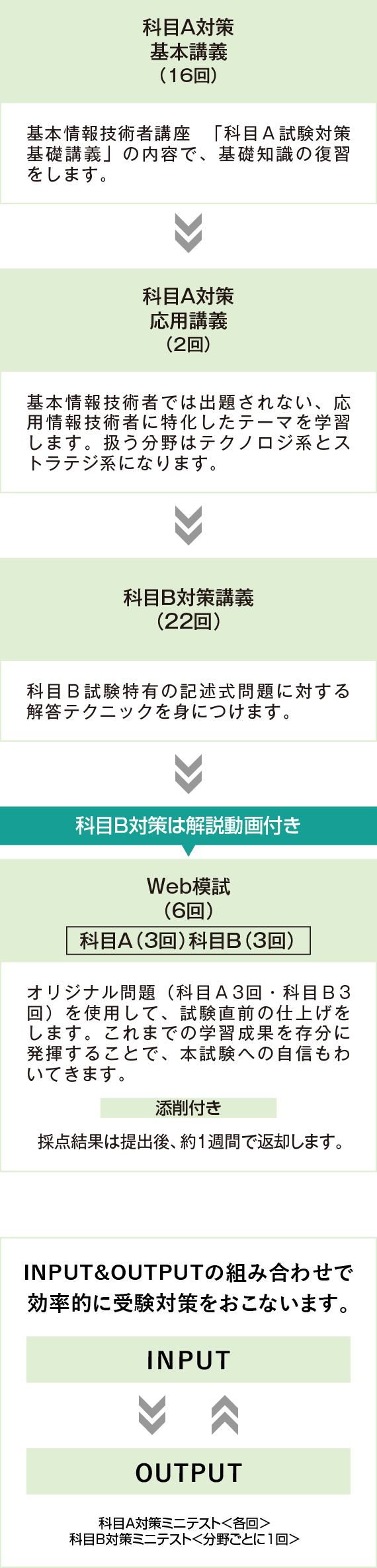 基本情報技術者の科目A試験の復習から始め、応用情報技術者試験にのみ出題される内容の確認、問題演習へステップアップしていきます。全22回の科目B対策講義で記述式問題対策もしっかり行います。