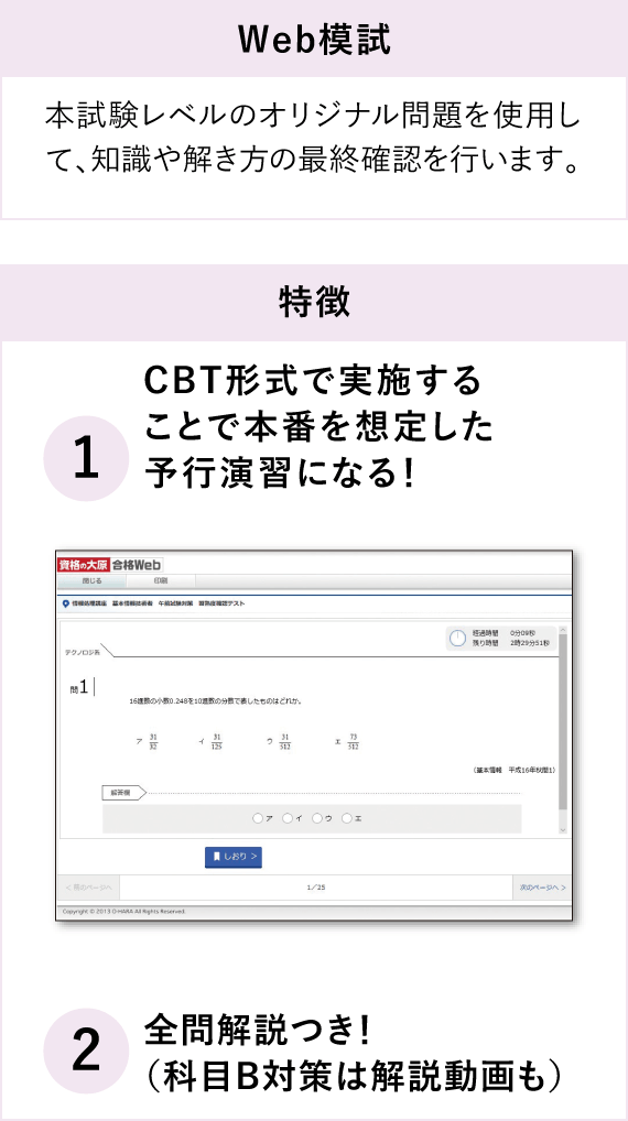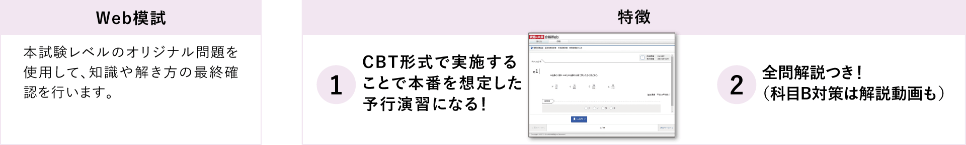 本試験レベルのオリジナル問題を使用して、学習の仕上がり具合や時間配分などを確認します。CBT方式に不慣れな方も、Web模試で不安を解消します。