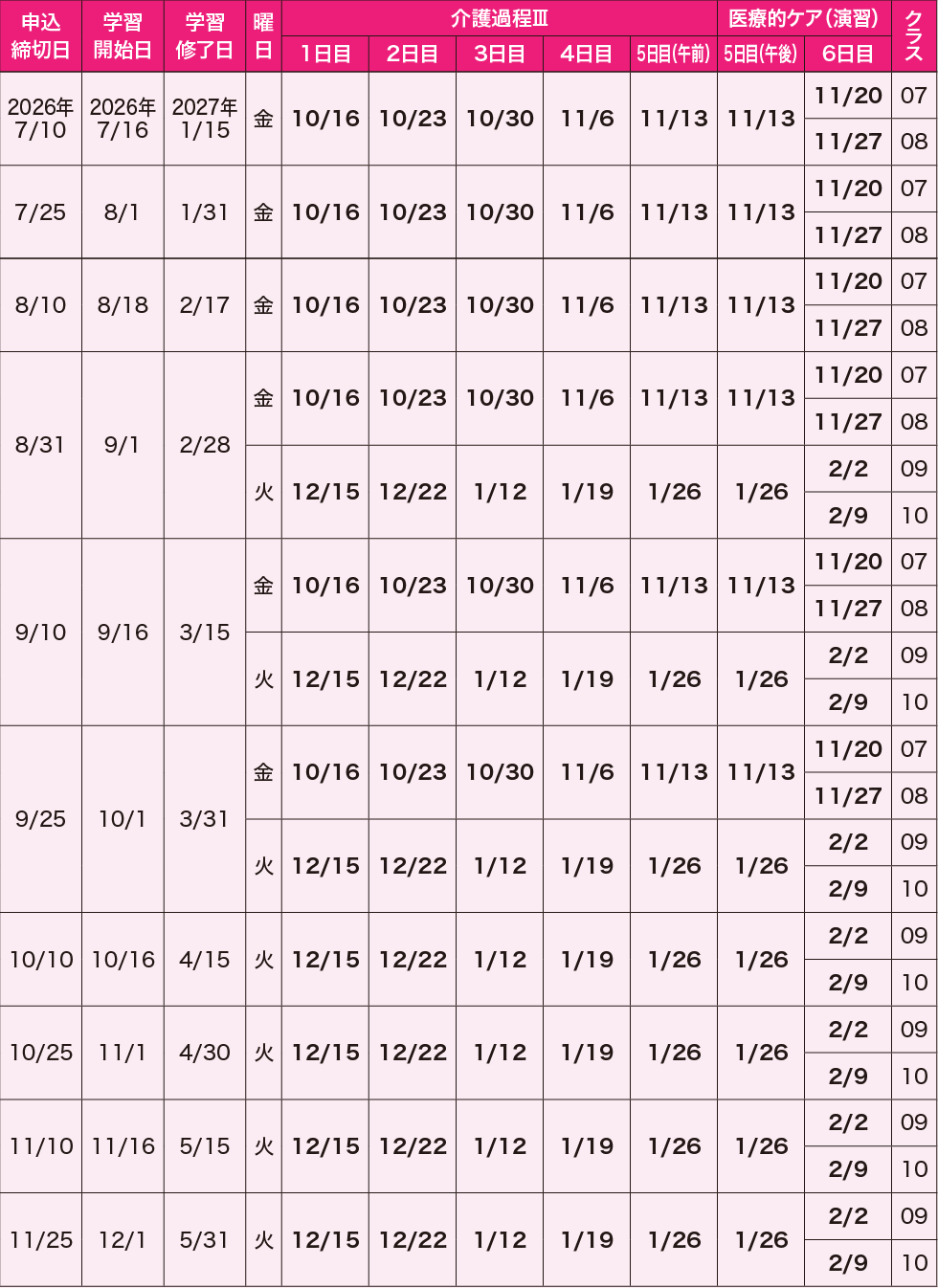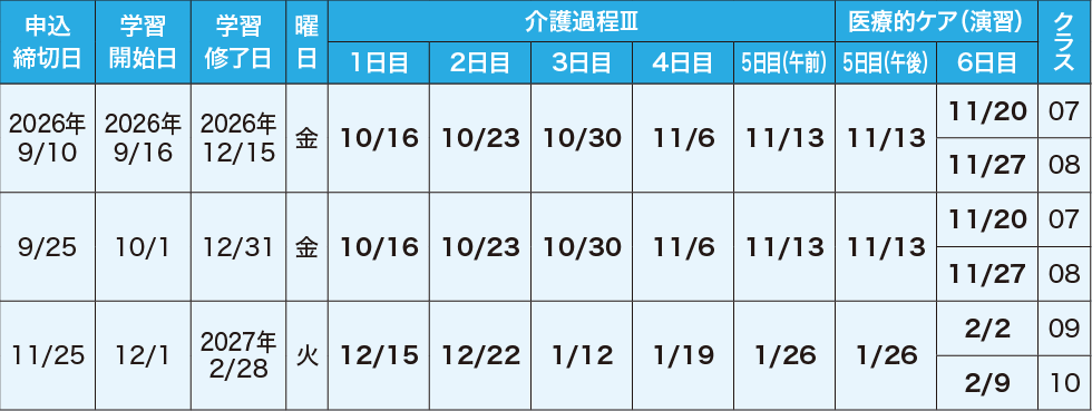 ※3ヵ月コースはホームヘルパー2級取得者および介護職員初任者研修修了者が対象です。