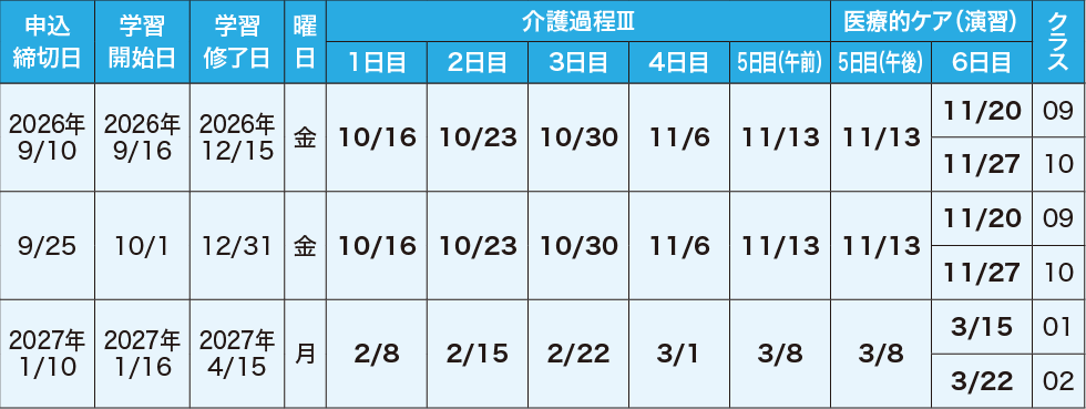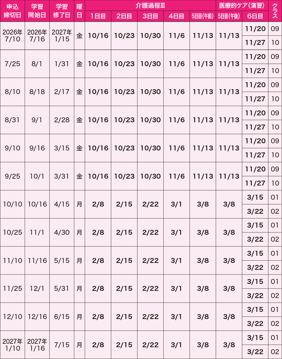 ※3ヵ月コースはホームヘルパー2級取得者および介護職員初任者研修修了者が対象です。