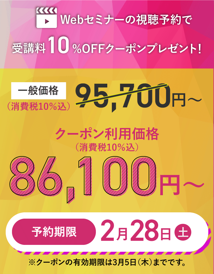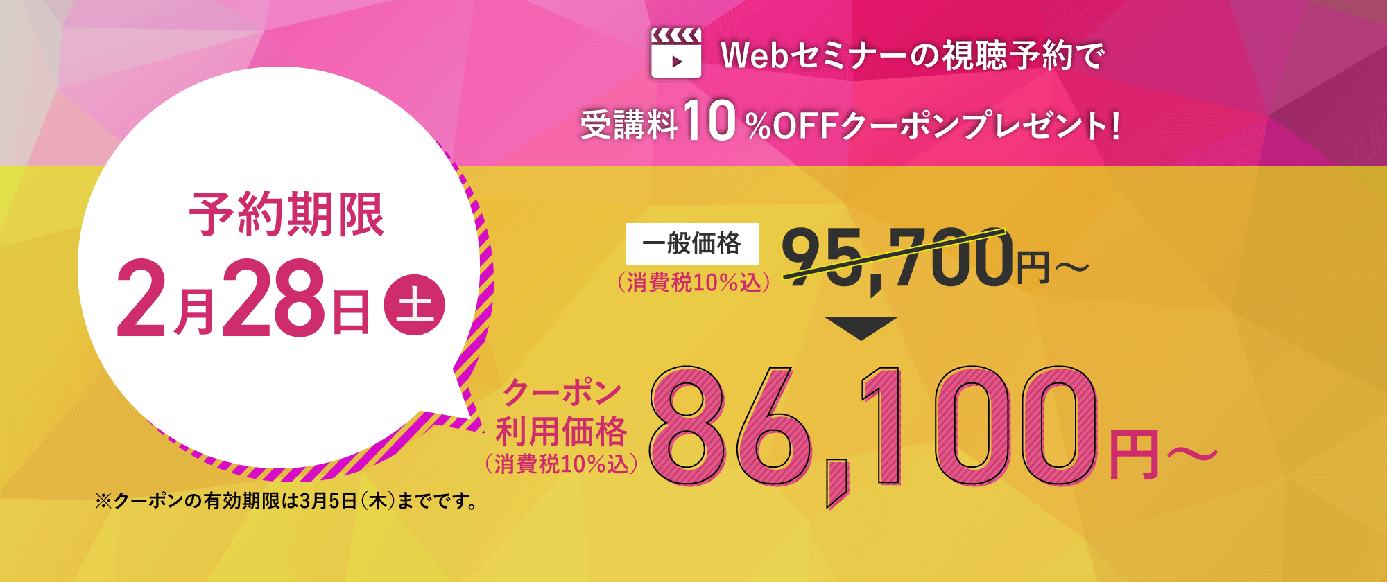 ※クーポンコードが利用できるスクーリング実施会場エリアは、北海道・東北・関東です。関西・九州エリアのスクーリング会場は対象ではありません。
