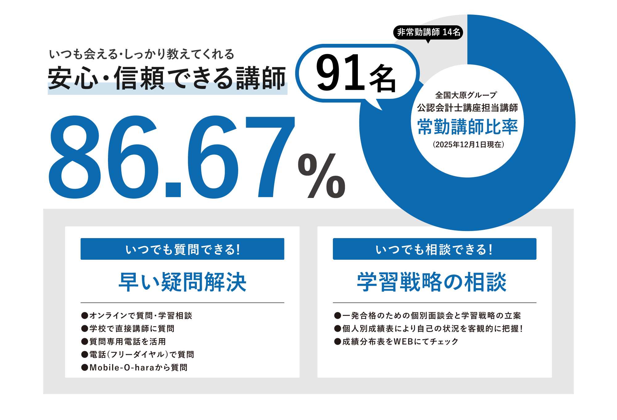 合格への最短ルートは、学習や計画の疑問をその場で解決することです。大原には、あなたの学習を毎日支える講師が多数在籍しています。質問・相談・学習計画・弱点分析まで、プロの講師があなたに寄り添い、合格まで伴走します。「一人で悩む時間」をなくすこと。それが合格に最も効果的なサポートです