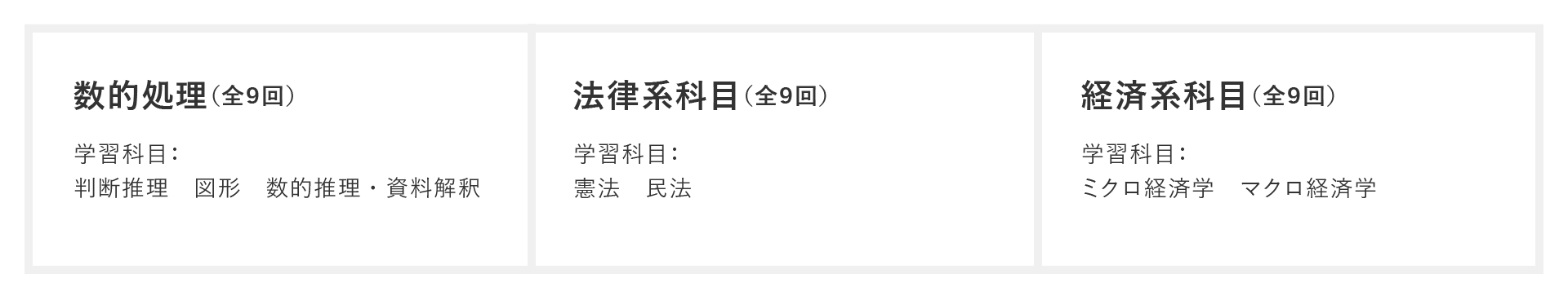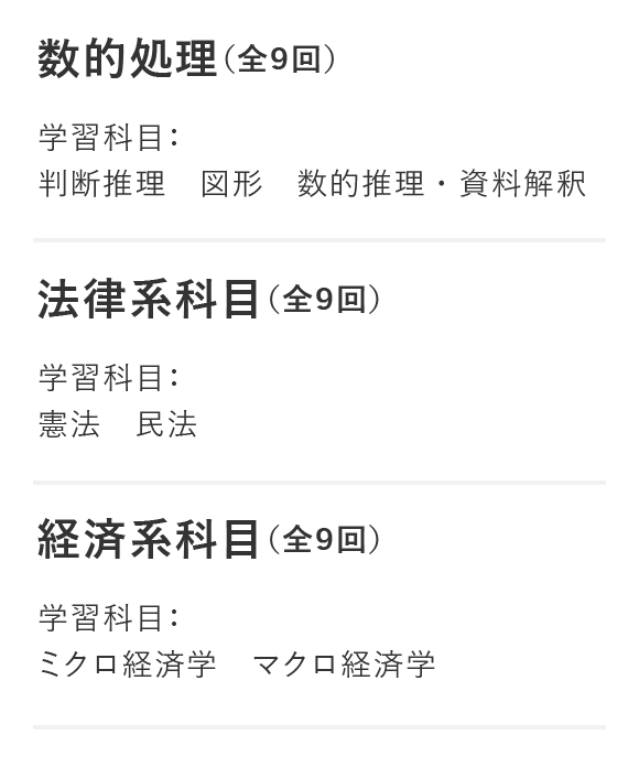 公務員入門講座の『数的処理』『法律系科目』『経済系科目』をパックでお申し込みいただけます。併せて学習することで、より確実に合格を目指せます。