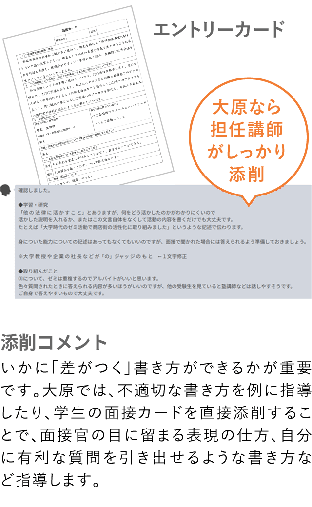 大原の模擬面接では、受験生から収集した面接体験記をもとに、志望先を想定した質問をします。そのため、練習を重ねることできちんと自分の考えを志望先の相手に伝える面接力が身につきます。また、一部で実施している集団面接や集団討論・プレゼンテーションについても、実践トレーニングで対応しています。