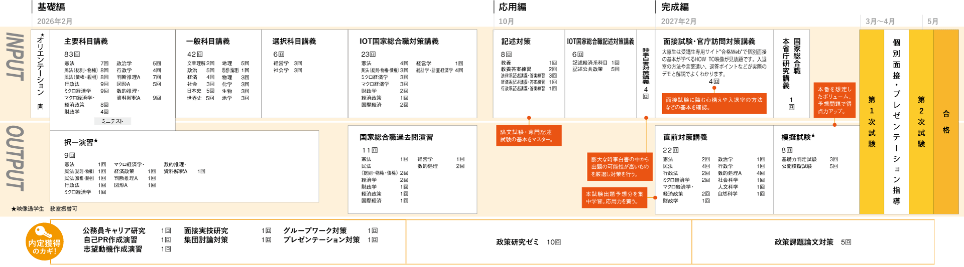 個人では対策が難しい集団面接やグループワーク、プレゼンテーションを取り入れた【政策研究・人物試験対策】と、科目対策・記述対策・模擬試験が含まれたオールインワンのコースです。