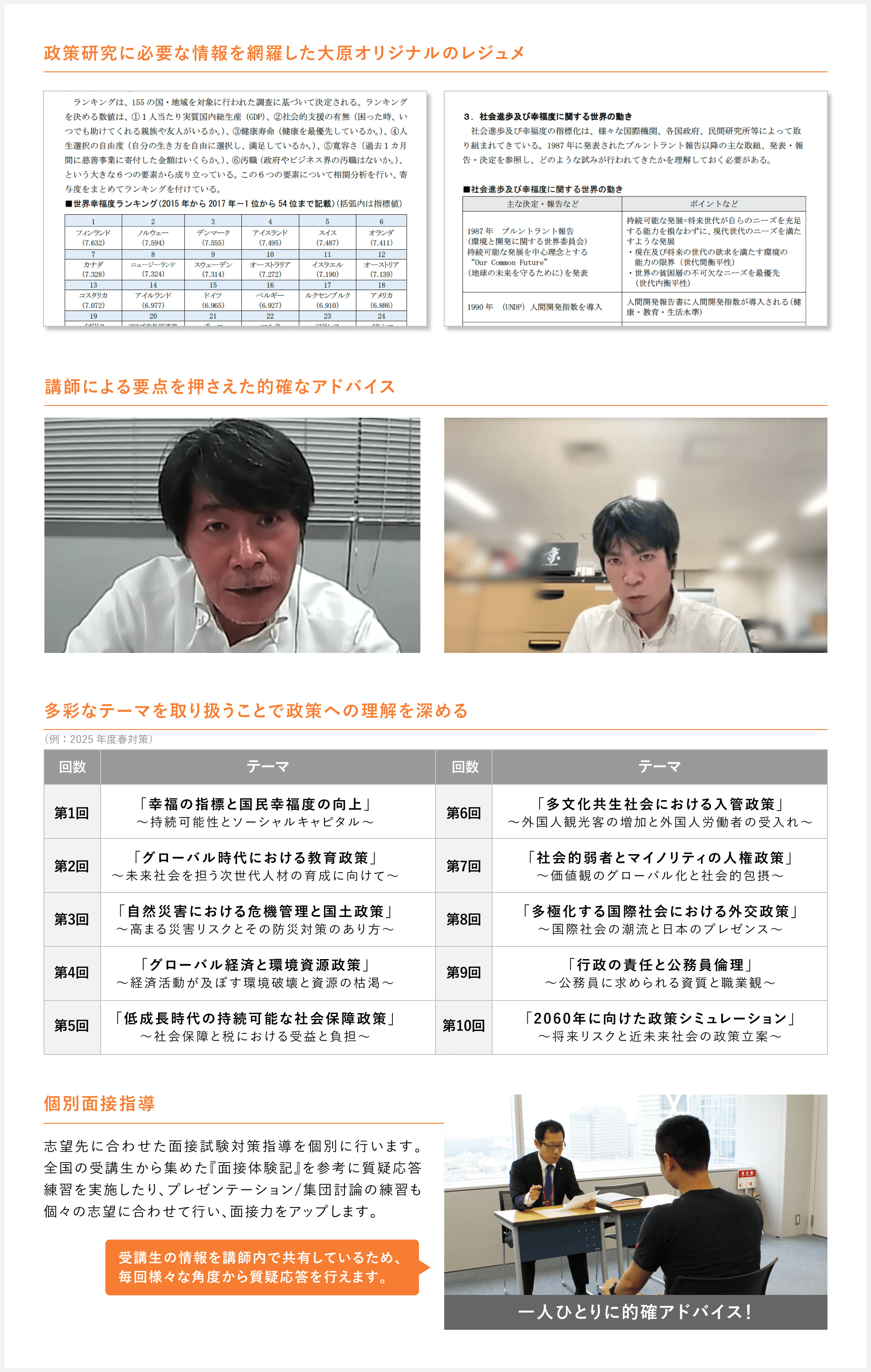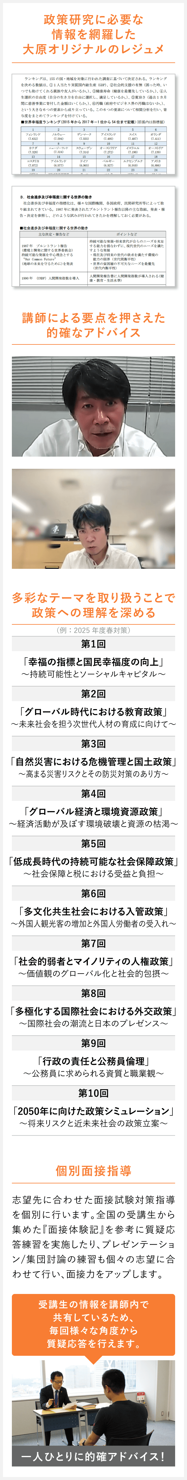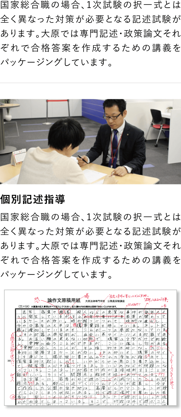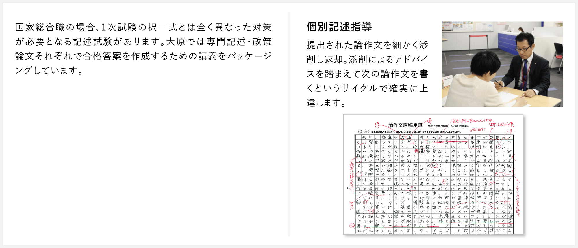 国家総合職試験で合格・内定を勝ち取るには省庁や政策の研究、企画・立案のための理解力や思考力が必要不可欠です。大原では国家総合職試験を突破するために徹底した人物試験対策を実施します。