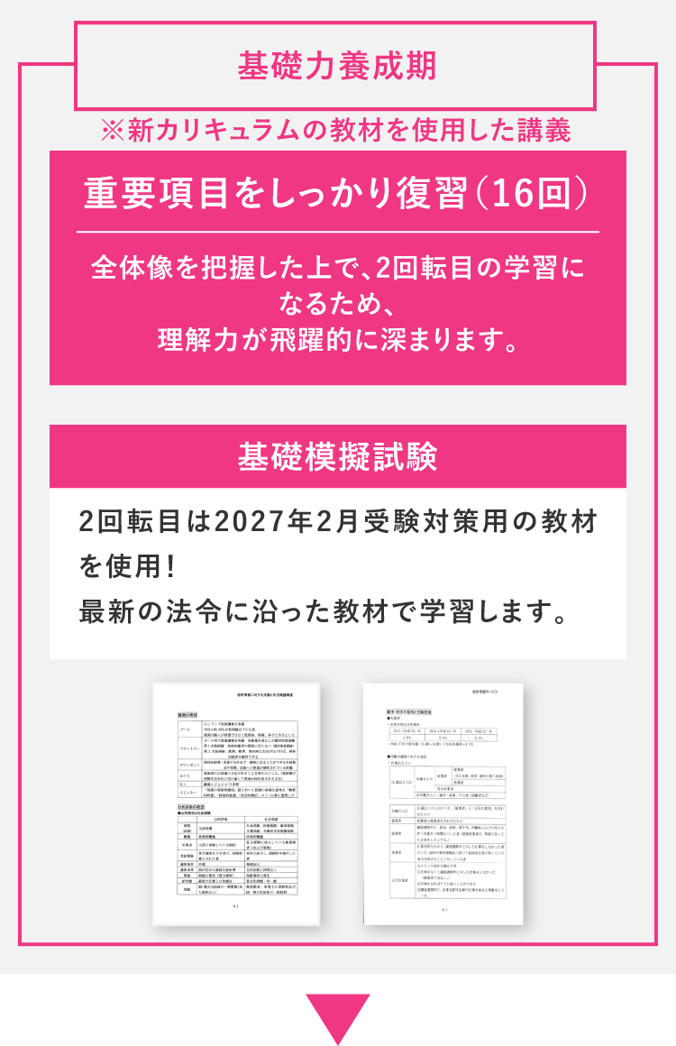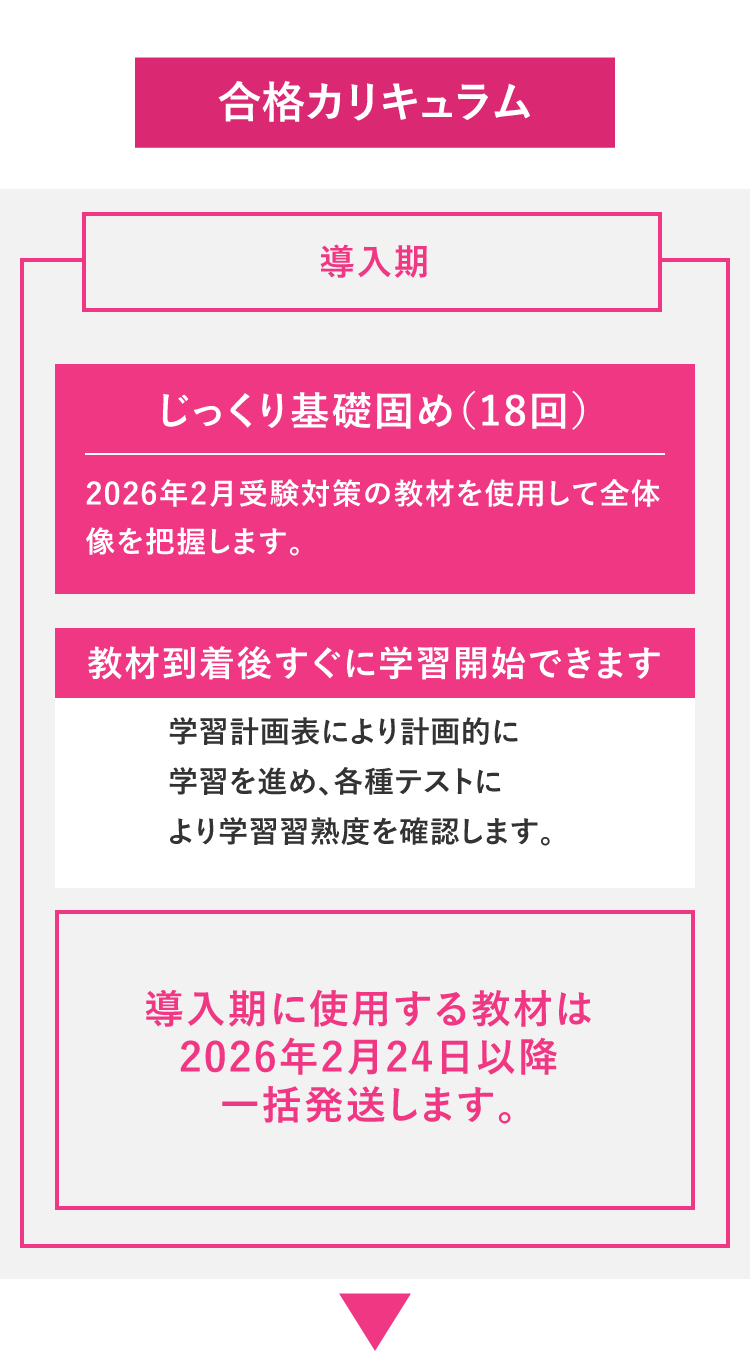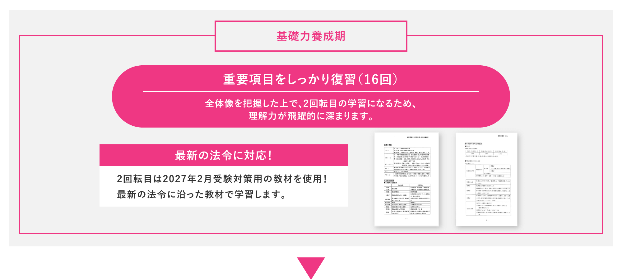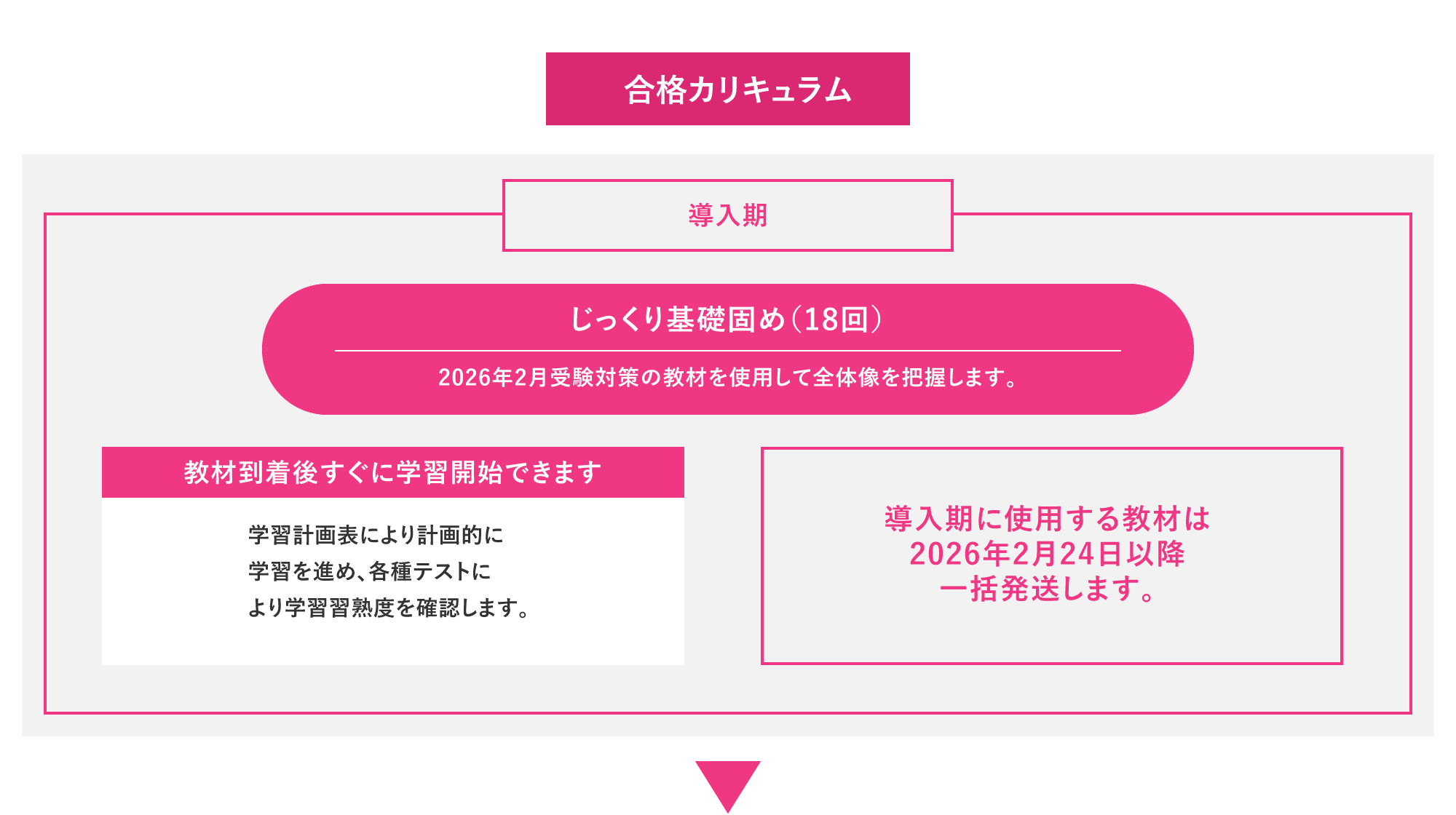 2026年2月受験対策の教材を使用することで、早期からご自身のペースで基礎学習を開始し、9月から2027年2月受験対策用の教材を使用して学習するコースです。導入期では、過去問題に一通り触れていき、基礎力養成期では全体像を把握した上で2回転目の学習をすることになるため、万全の準備を行うことができます。