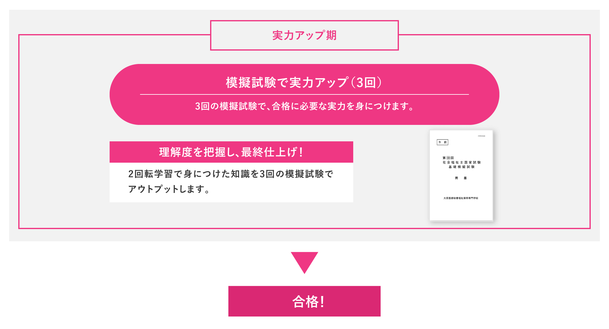 導入期では、過去問題に一通り触れていき、基礎力養成期では全体像を把握した上で2回転目の学習をすることになるため、万全の準備を行うことができます。