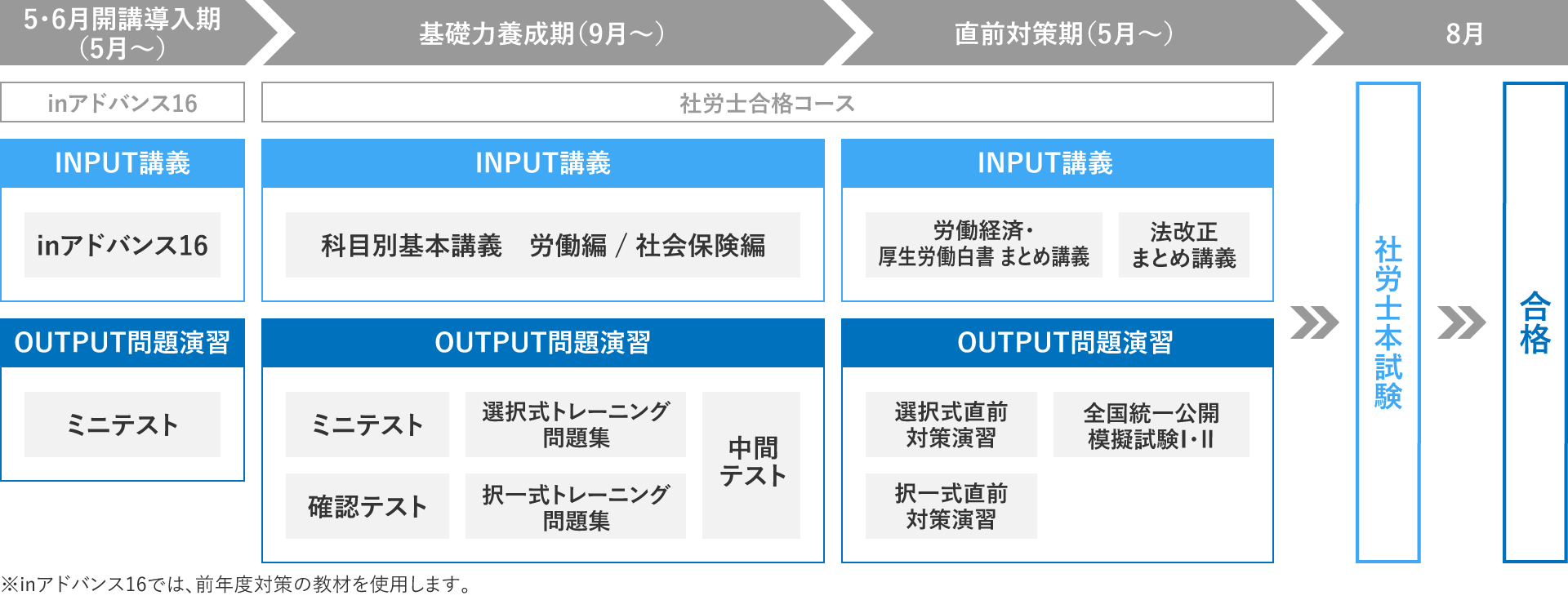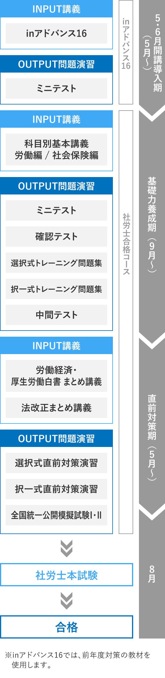 「社労士合格コース」と「inアドバンス16」がパックになった「初学者の方」におすすめのじっくり型のコースです。