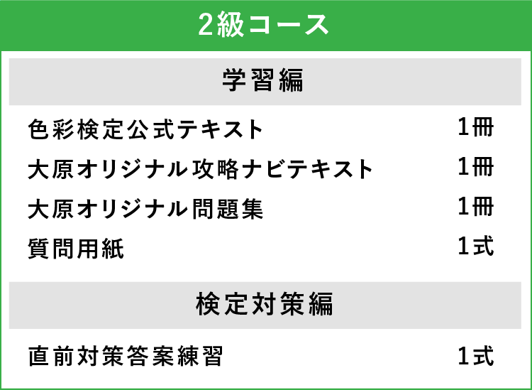 3級と比べ、より専門的に色彩の知識を問われる2級検定ですが、分かりやすく学習を進められるように考えて作成された教材とカリキュラムとなっています。