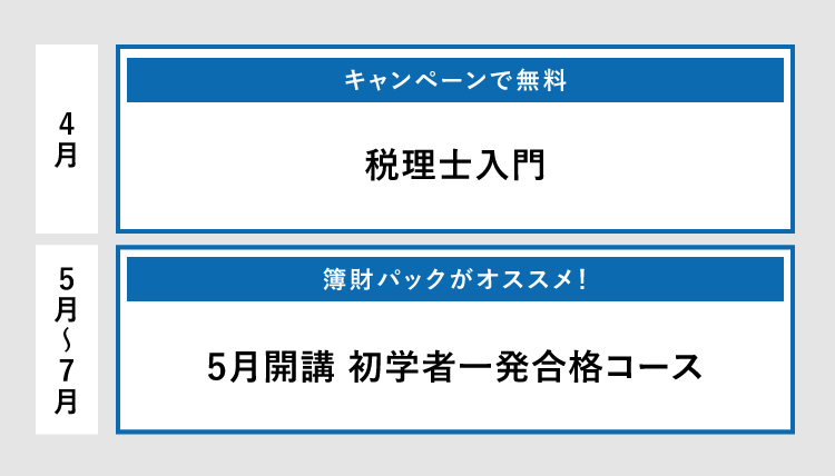 簿記の学習が初めての方のために、税理士試験の学習に必要な簿記知識を効率的に習得できる税理士入門をご用意しております。税理士入門で学習に必要な日商簿記3級レベルの知識を学習できます。その後、5月開講初学者一発合格コースへ進みます。