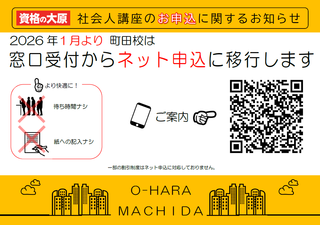 [資格の大原]町田校は、2025年12月22日を持ちまして、受付カウンター窓口での社会人講座申込に関する手続きを終了し、2026年(1月5日)より、インターネットでのお手続きに移行いたします。