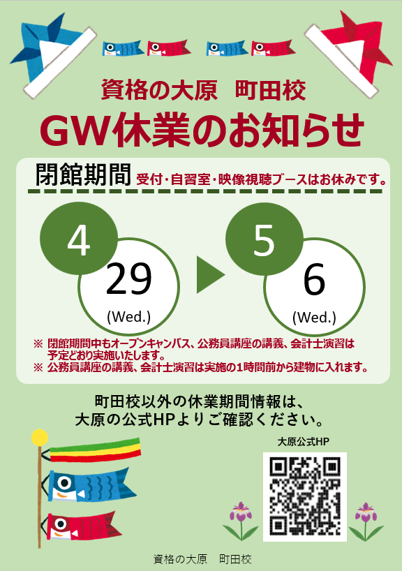 ゴールデンウィークにつきまして下記の期間は休業となります。