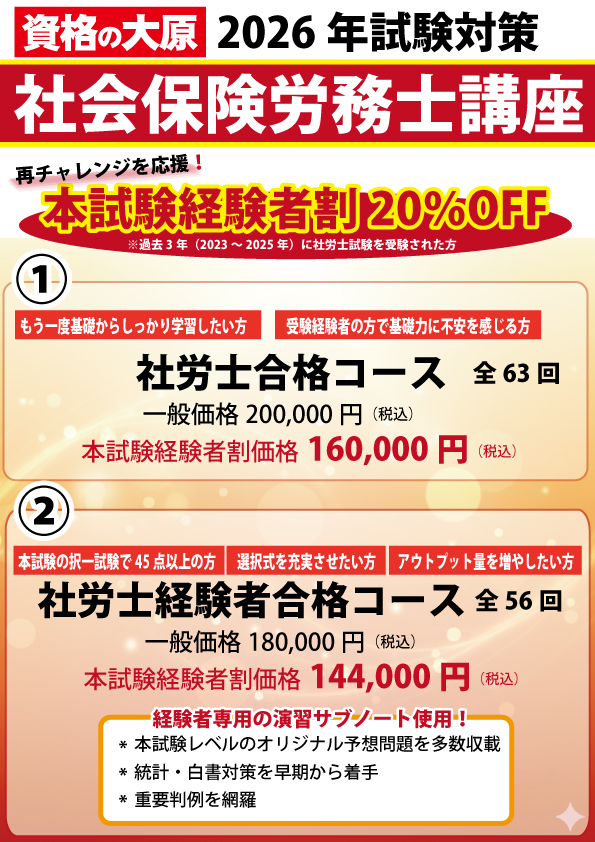【社労士】再チャレンジを応援!あきらめないで 2026年試験対策★本試験経験者割引実施中‼(映像通学)