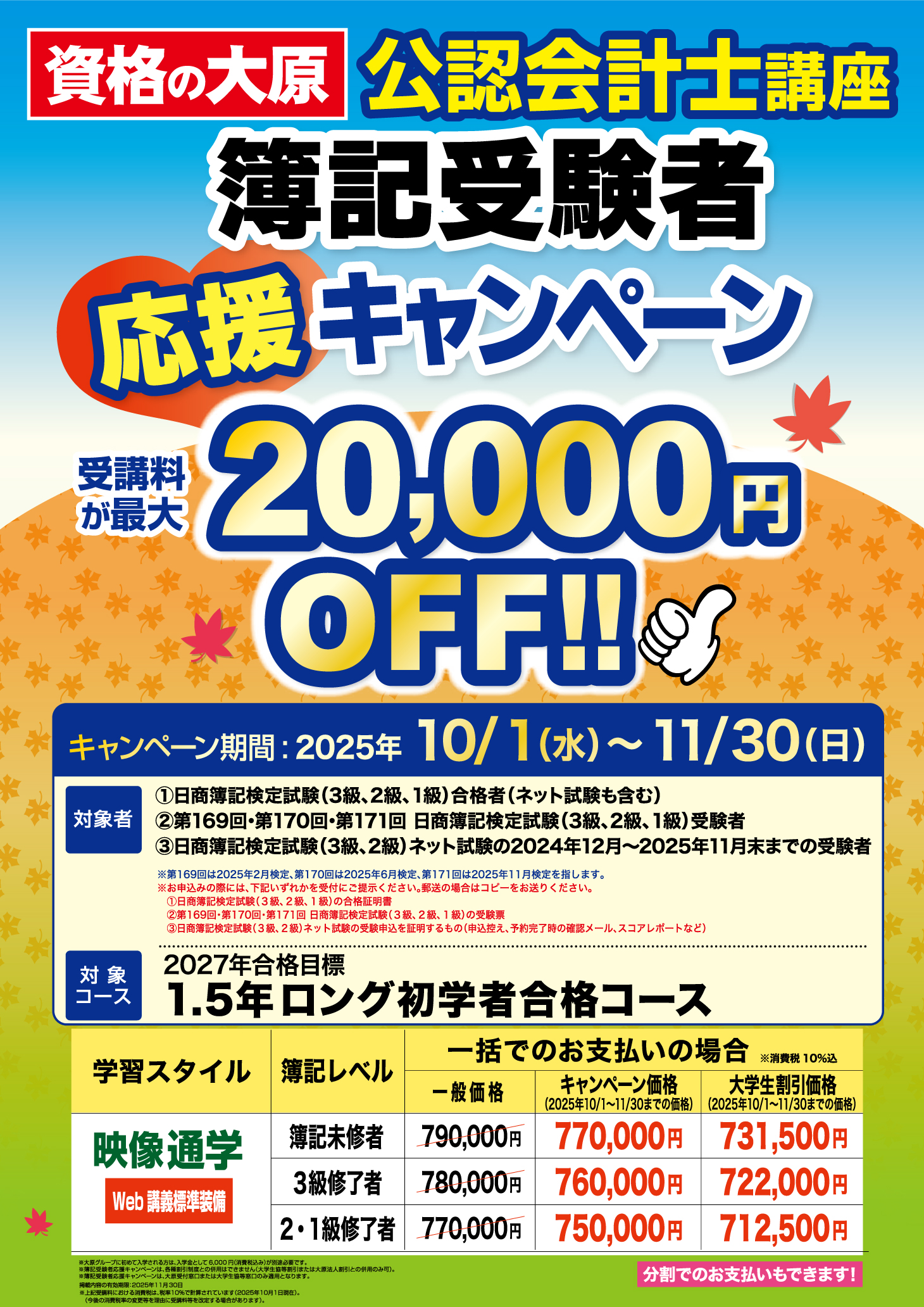 【会計士】簿記受験者応援キャンペーン実施中‼ 2027年1.5年ロング初学者コース(26年12月短答試験目標・27年論文試験目標映像通学)