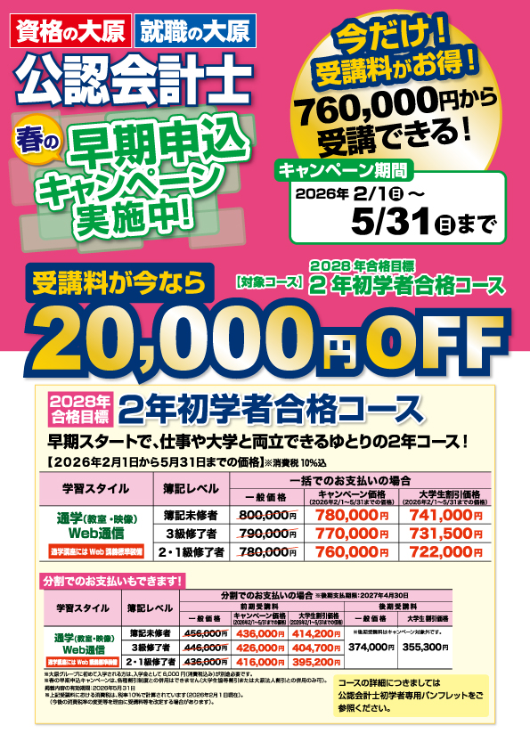 【会計士】2028年2年初学者合格コース★早期申込キャンペーン実施中‼ 今なら最大20,000円OFF‼