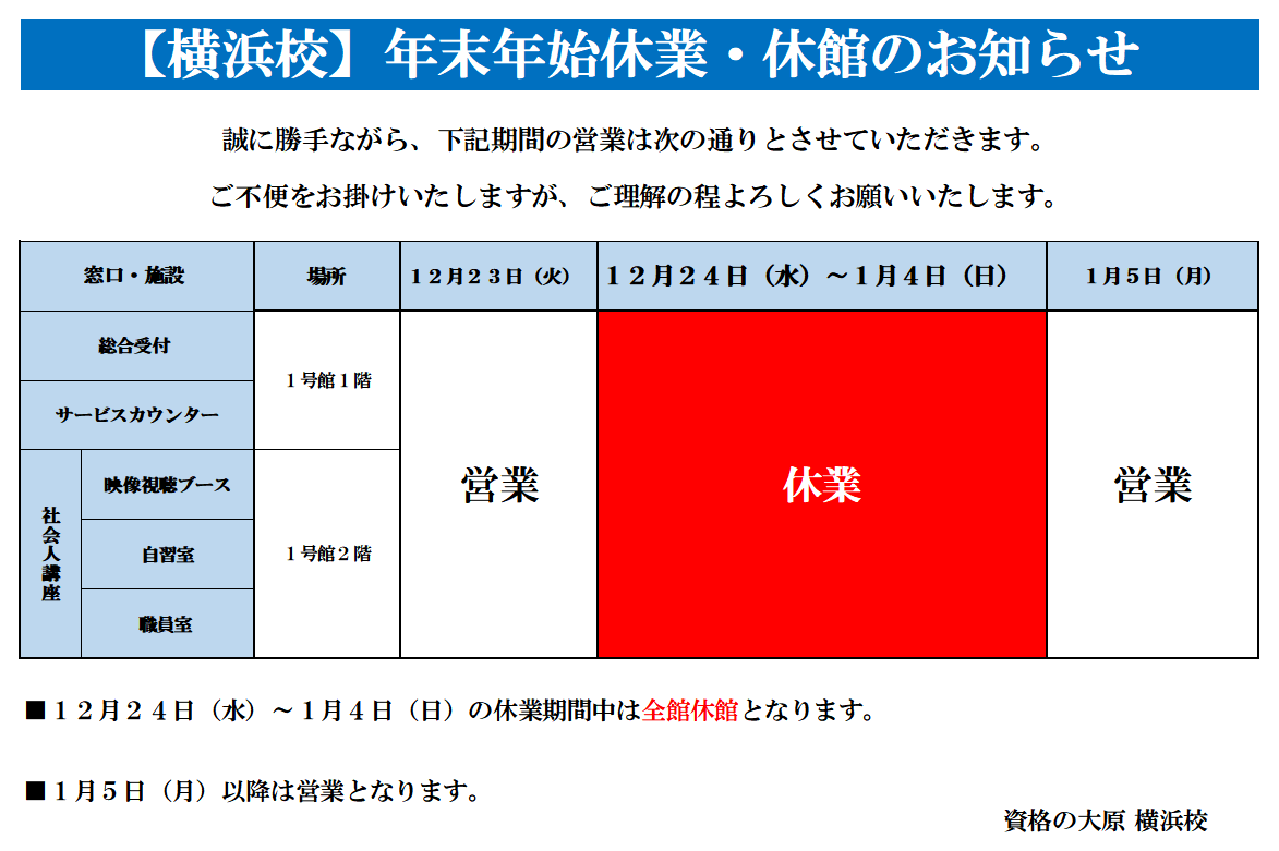 横浜校は、2025年12月24日(水)~2026年1月4日(日)の期間、休館となります。
